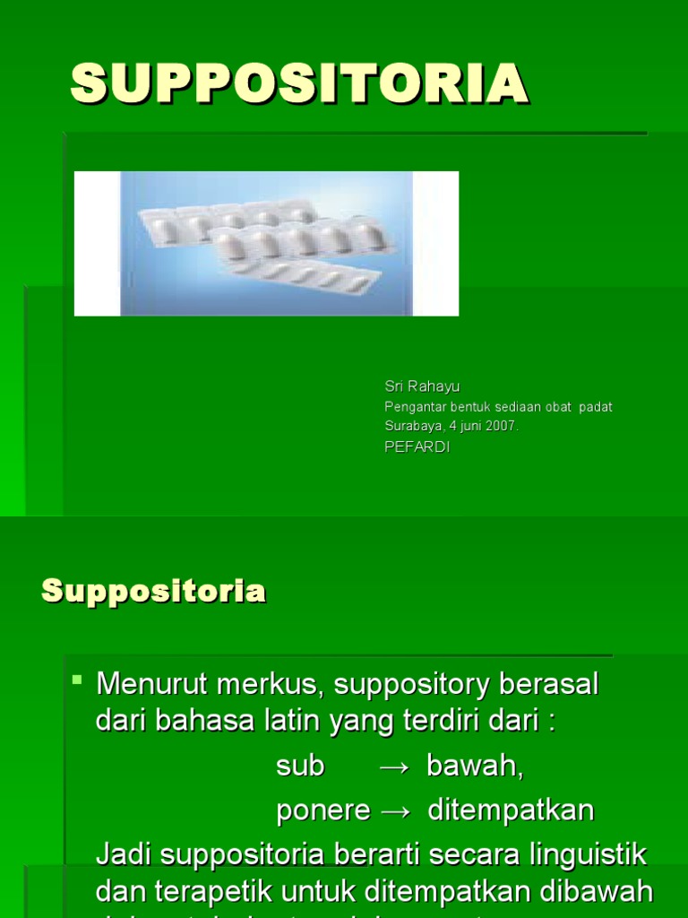 1234567 S I P. 1 sampai 2 kali sehari 2 suppositorium Catatan. Contoh obat-obat untuk tujuan sistemik Aminofilin dan theophilinum untuk menghilangkan asma.
